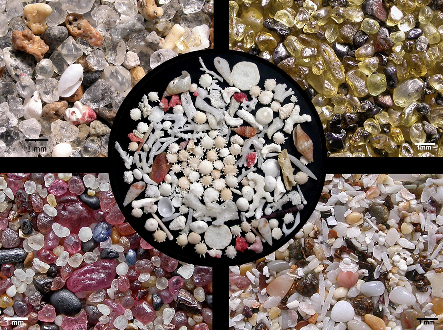 Clockwise from top left: Bahia de Samana, Dominican Republic; Myrdal, Vik, Iceland (olivine and obsidian); Al Bustan, Oman; Brétignolles, France; Center: Enubuj Island, Kwajalein Atoll, Marshall Islands.