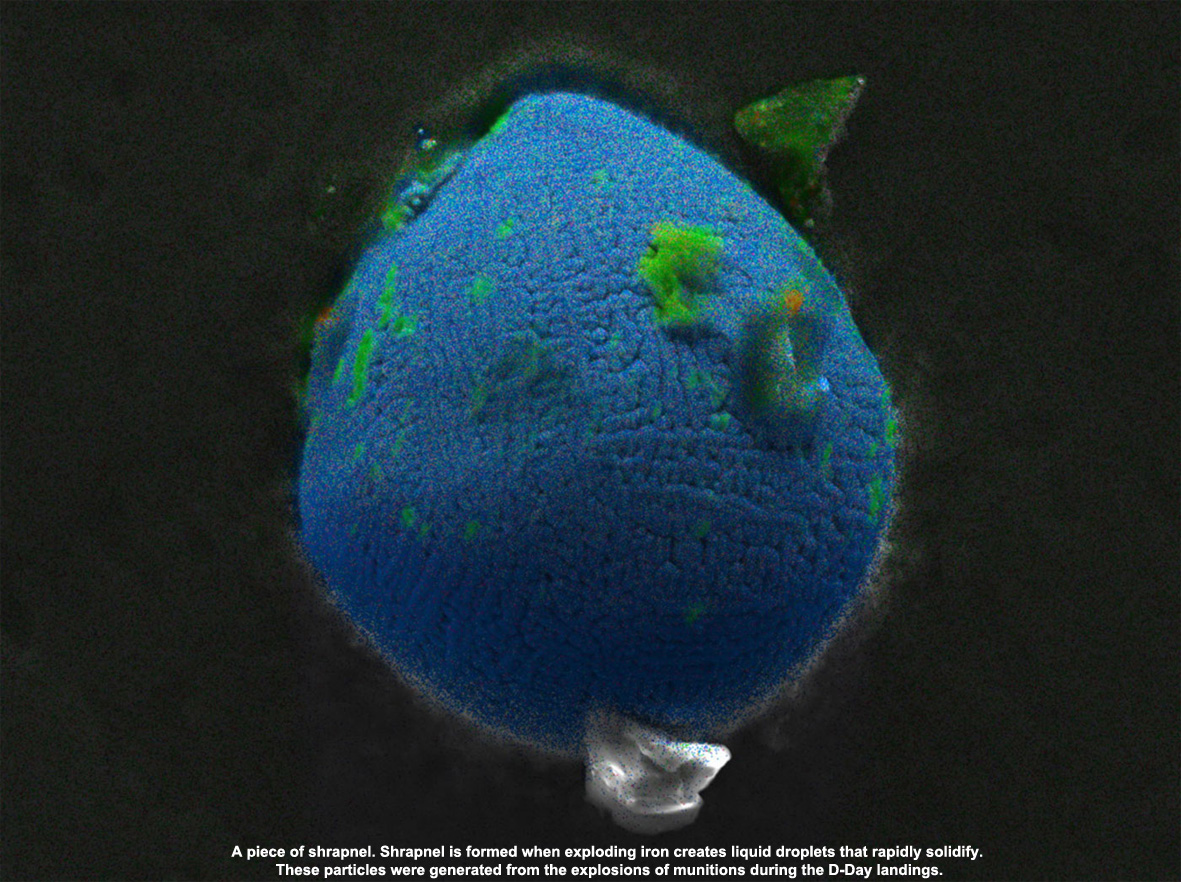 Today, the remains of vast quantities of Allied and German war material lie embedded in the beaches of Normandy, mixed in with the natural grains of sand. Shrapnel, bullet casings and armour plate are still there, 70 years later, transformed by the sea, salt, and sun into an array of micro-artifacts that span the divide between technology and nature. Archaeologists have said that up to 8 percent of this sand is made up of war shrapnel. Waves, storms, and rust will wipe this microscopic archaeology from coastal Normandy in another hundred years, and with it, the physical remembrances of WWII.