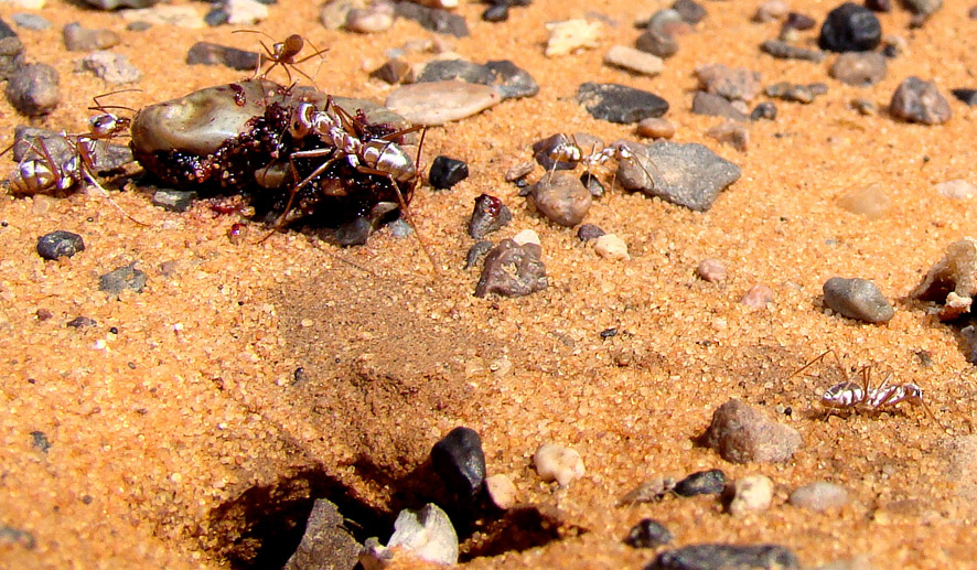 To forage on the carcasses of the less strong, these ants wait in their nests, preparing heat shock proteins, until the heat of the day becomes intolerable for their predators, and then boldly go about their business with body temperatures up to 50 degrees centigrade and ground temperatures in the 60s. The proteins help protect them, as does their reflective silver colouring, and they move at an amazing speed (the human equivalent of over 400 kilometres per hour) on unusually long legs for an ant, keeping themselves off the searing ground surface. Their extraordinary navigational abilities guide them back to the nest by the shortest route. Even so, the silver ants can only spend twenty minutes outside before they succumb and become food for their colleagues.