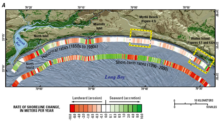 And the dramatic rates of shoreline change, both long-term and short-term, are shown in the figure below. Note that the scale is in meters per year, ranging from +10m/yr to -10m/yr, over just this short length of coast.