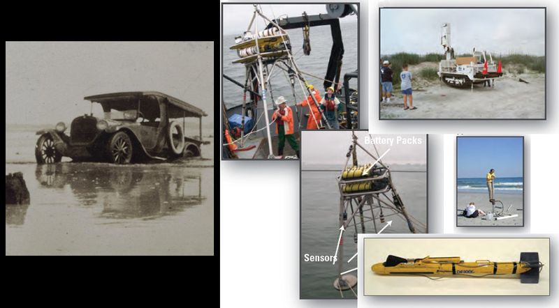 The study is truly interdisciplinary, and employed a wide-ranging set of tools. Sidescan sonar, and the acoustic back scatter that it generates, allowed mapping of sediment types. Ground penetrating radar and different sub bottom profiling techniques revealed the structure and sedimentological/geomorphological history of the sub-seafloor geology. Current meters, sediment traps, wave-height sensors, and other instruments were attached to sturdy metal frames and anchored to the seafloor to record constantly changing environmental conditions and sediment flux. The operations (below, right) were clearly more successful than those of the traverse and triangulation party of L. P. Raynor in 1924 (below, left, photo from http://www.photolib.noaa.gov/).