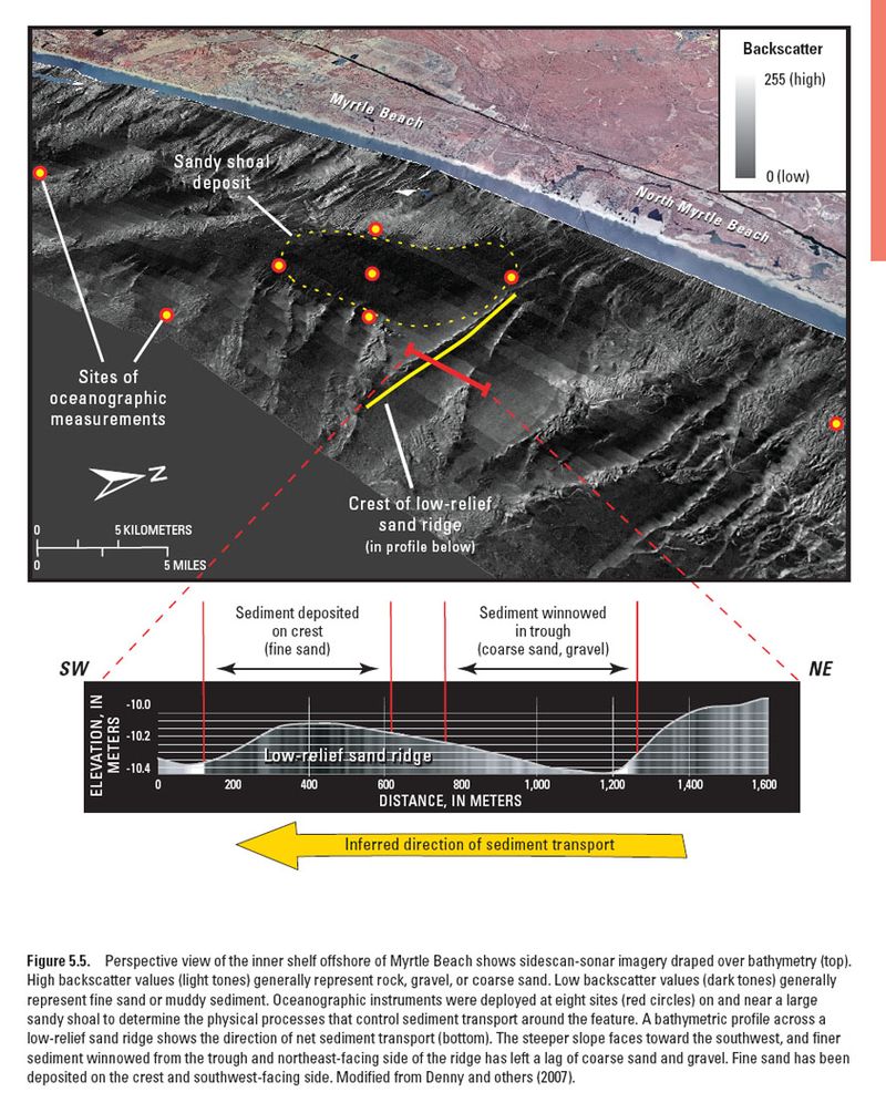 I won’t attempt to describe here the results of this extraordinary programme of research, but they are fascinating. Substantial contrasts in coastal processes arise from sand supply and availability. Sand-starved segments of the coast are characterised by exposure of older sediments and sedimentary rock (as old as Cretaceous in age, from 70 million years ago) and respond to wave and storm action very differently from sand-rich segments. Beach profiles and the dramatic changes to those profiles vary enormously both with sand availability and with exposure to seasonal change and storm events. Sediment budgets and individual littoral cells, along with their specific sediment sources and sinks, change rapidly along the coast and on a scale smaller than we have previously been able to define. Sediment flux is hugely variable with the time of year and wave and weather conditions, displaying complete reversals of transportation direction. The illustration below is just one example of the detailed analysis of shallow offshore processes, sand ridges in this case lying just oceanward of the popular resort of Myrtle Beach.