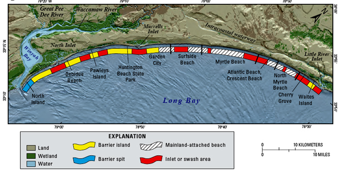 The full report, downloadable from the USGS link above, is a case study of the state of the art of our evaluation of how a single stretch of coast works. It’s the summary of a six-year multidisciplinary study of the northeastern coast of South Carolina by the USGS in cooperation with the South Carolina Sea Grant Consortium (SCSGC). “The main objective of the study was to determine the geologic and oceanographic processes that control sediment movement along the region’s shoreline and thereby improve projections of coastal change.” The stretch of coast studied is the “Grand Strand” segment, three headlands south from Cape Hatteras (where the lighthouse was heroically moved after decades of futile attempts to stop natural processes). It’s only a 100 km length of coast, but it’s a complex system of beaches, barrier islands, back barrier lagoons and tidal inlets. The variation of shore types is illustrated in the figure below, from the report.