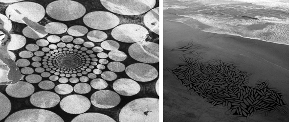 Jim Denevan walks out onto a freshly washed Northern California beach, bends down, and draws a circle, the size of a coin, in the sand with his finger. More circles create a spiral nest, the outer ones growing larger. Using a driftwood stick as his paintbrush, he draws bigger circles in the sand, each one nestling with the previous; the design grows fractally. Denevan does all this freehand—there is no outline, no preliminary design; the artwork simply flows from his mind through the choreography of his movement. His work evokes a Japanese karesansui, popularly known as a Zen garden, with its contemplative design of raked sand. Denevan’s design is monumental, ultimately occupying the entire width of the beach. He uses a large rake to highlight the outline and to fill in the spaces with texture. A few hours later, the tide destroys the art and renews the canvas. For Denevan, the transience is part of the art; it recognizes “some kind of truth about life—what is grand, or what is fragile. . . . Everything is transitioning into something else.” Denevan’s designs are diverse, ranging from huge perfect spirals, to representational images, to complex circles and linear shapes, suggesting a more fragile version of the Nazca lines, the gigantic figures in the Peruvian desert—themselves created by the removal of desert stones to expose the light-colored sand beneath.
