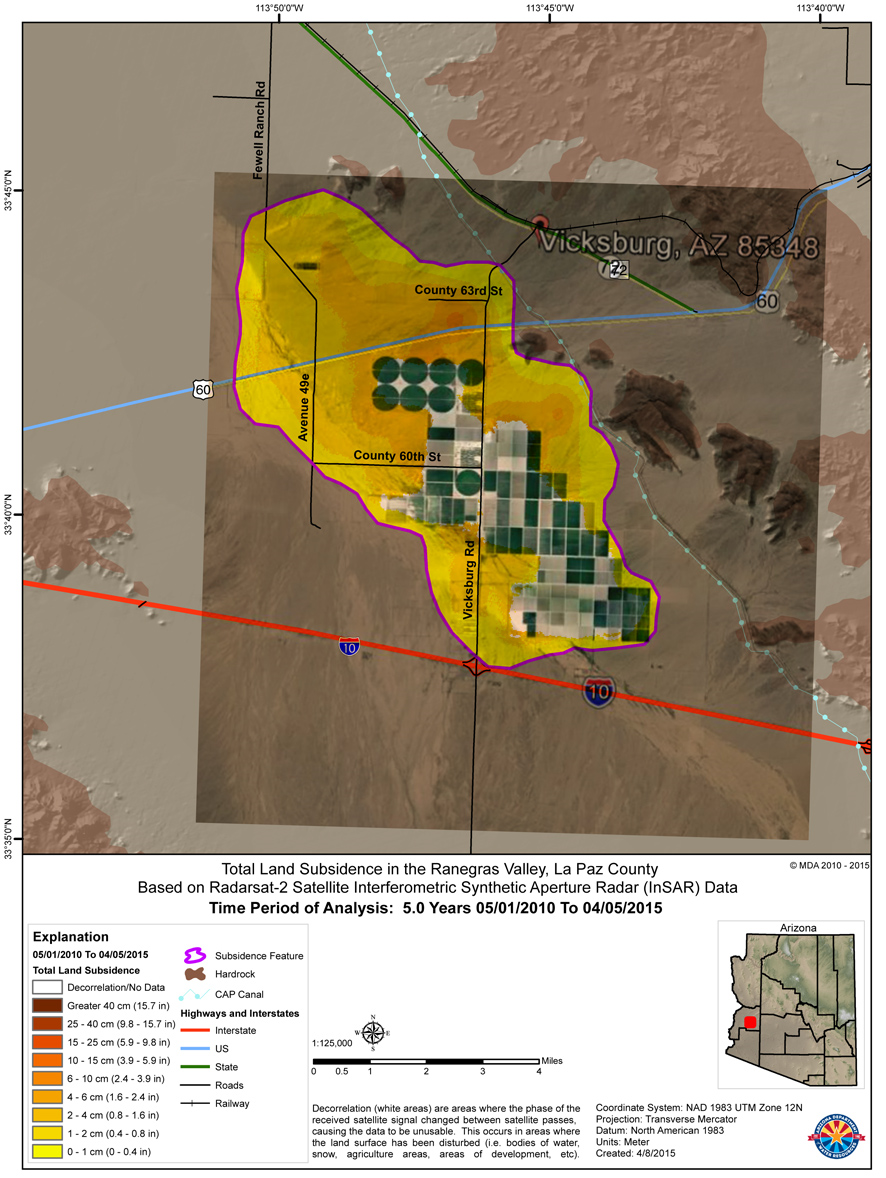 And then there’s the ground subsidence caused by that water extraction. The Arizona Department of Water Resources publishes analyses of this problem, and it it is very clear that subsidence of up to 15 cms has occurred over the last five years in the cultivated area of Ranegras Valley: