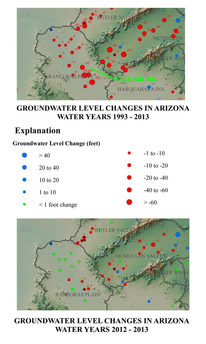 Arizona publishes a fair amount of data on groundwater and well conditions. Here, for example, are two maps showing the changes in groundwater levels in key wells in the Vicksburg area over the last twenty years and the last year: