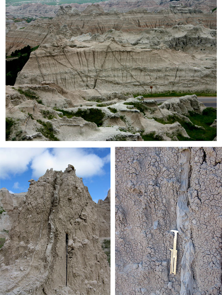 The same process, on a more modest and cooler scale, can be seen below sand volcanoes, where the fissures are plugged with sand, silt, and mud. We see these things too in the geological record - clastic dikes (since they are formed of clastic, fragmentary, sediments0 cutting through the surrounding rock. They record past episodes, sometimes on a large scale, of sediment liquefaction. The examples below come from the Badlands National Park of South Dakota (from a good article by the University of Nebraska at Omaha, Dept. of Geography and Geology). These things, for obvious reasons, are sometimes also referred to as injectites.