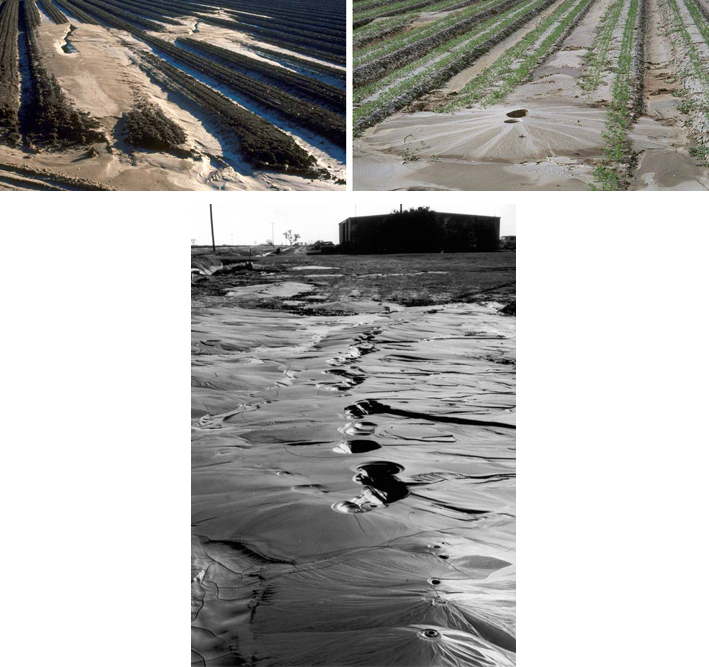 As in Bhuj, liquefaction during an earthquake also shows up in bizarre ways. Layers of sand below the ground surface will liquefy and, under the pressure of the overlying sediments, will exploit any fissure or other line of weakness to flow upwards and burst out on the ground surface as an eruption of sand and water. Known variously but descriptively as sand volcanoes, boils or blows, these can appear anywhere. The image at the head of this post shows a sand volcano that erupted during the Loma Prieta earthquake in the median of Interstate 80 west of the San Francisco-Oakland Bay Bridge toll plaza. The images below are of sand-inundated fields after the Loma Prieta event (left) and, right and below, the Imperial Valley earthquake of October 15 1979 (this seems to be a good week for California earthquake anniversaries).
