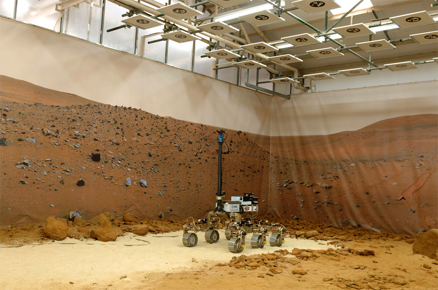 Filled with 300 tonnes of sand, the 30 x 13 m Mars yard at the Stevenage site of Airbus Defence and Space mimics the appearance of the martian [sic] landscape. Its walls, doors and all interior surfaces are painted a reddish-brown colour to ensure the rover’s navigation cameras are confronted by as realistic a scenario as possible. … The yard will also be available after the rover has landed on Mars in 2019, to help overcome any challenging situations that might be encountered on the Red Planet.
