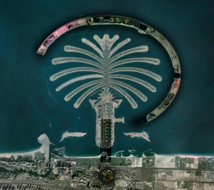 It was, of course, inevitable: once Dubai hit the headlines with its financial woes, the sand vocabulary usage would rocket into high gear: “Glittering ambition built on sand” reflects a common theme - “emerging market,” “palaces,” “dreams,” and the entire economy would seem to be built on the stuff - at least “city built on sand” is both literally and figuratively appropriate. “Sandcastle shatters” represents one end of a spectrum of opinion, the other of which is “a storm in a sandcup” - the latter is at least a novel image, but one is left at a bit of a loss as to what kind of vessel a sandcup might be. Various personages are predictably described as having “their heads in the sand” and urged to extract them; there are endless “lines in the sand” even though the material is constantly “shifting.” Then there’s the “sandstorm” imagery, with one source carried away on the poetic winds as “sandcastles hit by sandstorm.” All of these phrases come from just a brief search of Google News - and I haven’t even mentioned the sporting analogies: “sandtrap” is a start. And, as I was ruminating on what kind of impoverished language we would have to resort to without such phrases, it suddenly occurred to me that, should part of the western boundary breakwater of one of the outrageous Palm developments be swept away by a Gulf storm (or, in this case, Photoshop), then there is a clear and ominous hidden punctuation message in the design (above).