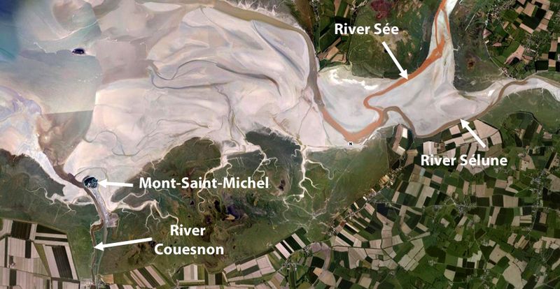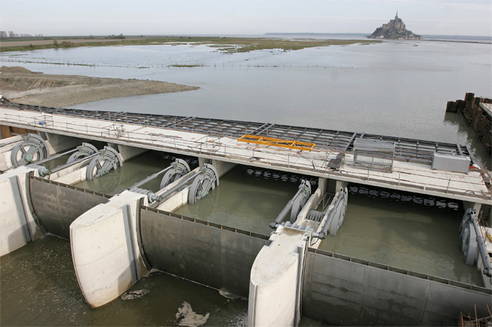The bay of Mont-Saint-Michel, in the coastal corner of France between Normandy and Brittany, boasts the fourth-largest tidal range in the world – up to 14 meters (46 feet) and the sedimentary drama to go along with it. It is an incredibly complex system. The tides carry sand and silt into the bay and leave much of it behind, augmented by the sedimentary loads brought down to the bay by the three rivers that drain into it. Roughly 700,000 cubic meters of sediment are added to the bay every year – it is, quite naturally, silting up (or, more attractively in French, experiencing ensablement – sanding up). As a result, the iconic World Heritage Site of the monastery towering above its isolated rock is increasingly losing its magnificent isolation and becoming united with the mainland. But this natural process has been greatly exaggerated by human meddling over the centuries and the rhythms of the bay profoundly changed and subdued. The natural processes operate on a scale far beyond that of any human endeavour, but it is possible to mitigate the effects of our meddling and restore the bay to at least close to its unhindered condition and allow natural ensablement to take its course. And that is exactly what is going on today in the bay, after years of preparatory work and research by a syndicate of authorities and institutions – a grand experiment so that Mont-Saint-Michel “ recovers pride of place as the central feature of the Bay, amid a seascape of sands constantly being reshaped by tidal and river water.”