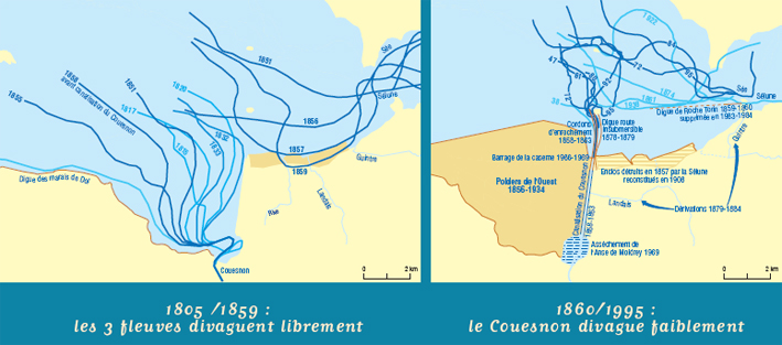 Mont-Saint-Michel began as an isolated rock remaining emergent from the bay as rising sea levels inundated the land following the end of the last ice age; it was periodically connected to the mainland by a natural spit of sand, a tombolo. But then, in 708 so the story goes, St. Michael approached the bishop of nearby Avranches, Aubert (later also a saint) and demanded that a monastery be built on the rock. Foolishly, Aubert ignored this request, finally setting about the task only after the irritated angel had burned a hole in the bishop’s head with his finger (now there’s a warning about procrastination and disobeying orders). The monastery and then abbey grew up over the centuries and then declined; after the French revolution, it became a prison that welcomed, among many anti-republicans, Victor Hugo – he described the tide as coming into the bay “with the speed of a galloping horse.” Along with this tide came the human one – pilgrims both religious and touristic. Today, it is the most-visited site in France outside Paris – three million people visit each year. It was teeming even in mid-September when I arrived, the massive parking lot and causeway (built where the tombolo used to be) filled with cars, camper-vans and buses. The causeway completely cuts off the natural currents and sediment movement of the inner bay, but it is by no means the only manmade disruption. In the 1850s, the channels of the Rivers Sée and Sélune were eroding the agricultural area south of where they entered the bay, and a dike (“digue”) was constructed to force their flow further north; over the following decade, the channel of the River Couesnon was completely controlled and “canalised” all the way out beyond Mont-Saint-Michel itself (the artificial banks for much of this were eroded or overwhelmed by sand by the 1960s). Critically, in 1969, a dam was built across the Cuesnon that effectively ended the power of the river to flush sediment out into the bay. The result of all these interventions was increased natural and manmade growth of the “polders,” the salt marshes that invade the bay and provide valuable agricultural land, together with accelerated sedimentation around the Mount itself. In modern times, the foundations of Mont-Saint-Michel were buried under two meters of sand that had built up since the nineteenth century - the entire sedimentological system of the inner bay was changed – dramatically illustrated in the two maps below showing the locations and changes to the river channels before and after these “management” initiatives.