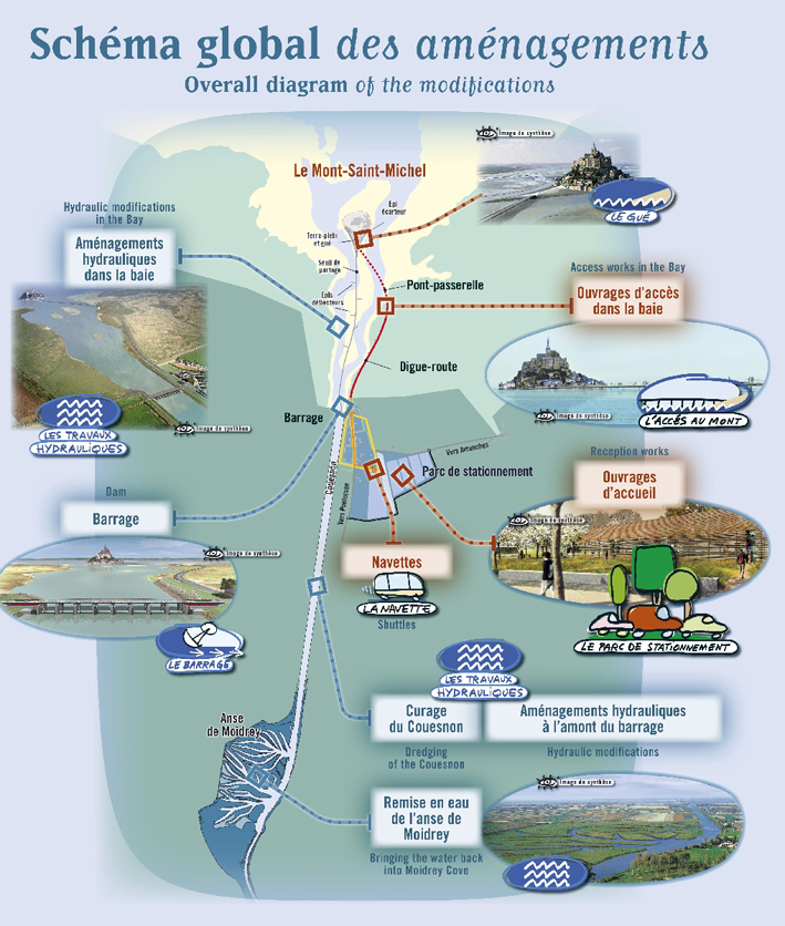 The site linked above is the source of much of the information and illustrations for this post, and includes a thorough documentation of the sedimentological work, downloadable as a pdf file here; it’s in French, but superbly illustrated. I have copied below a map of the main components of the whole Mont-Saint-Michel project for reference and further detail.