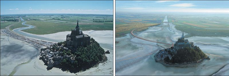 The effects of the project will be gradual, but in thirty years or so it is anticipated that the mean level of the sea bed around Mont-Saint-Michel will be 70 centimeters lower than today, millions of cubic meters of sediment will have been removed (much of it quite quickly), and the sea will have recaptured 50 hectares of today’s land. The scene today, below left, will have evolved into something like the view on the right. This is an extraordinary and ambitious project, a fascinating experiment in large-scale restoration of the natural landscape.