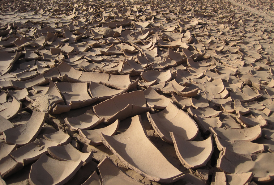 However, it wasn’t only the dunes that were intriguing, for whenever we came to areas of reg, the flat and stony desert, there were scatterings of red or grey clay potsherds – handles, fragments of bowls, even a couple of large, almost-whole pots. Some pieces were engraved with simple patterns, and a few had remnants of green glaze. Had these fragments been washed down from dwellings in the Atlas or the Draa Valley? How old were they? Sadly, other than a comment that they were ‘perhaps a hundred years old’ it wasn’t possible to get a definitive answer from our Berber guide.