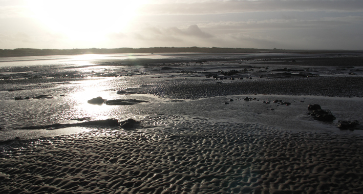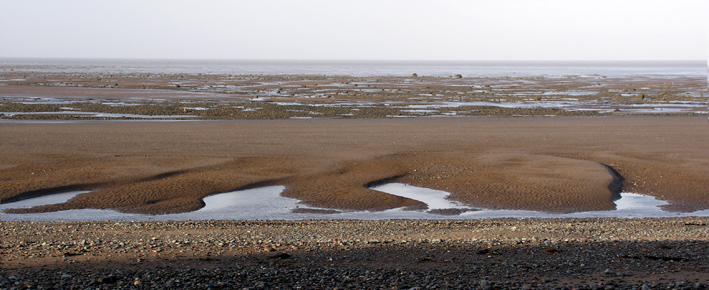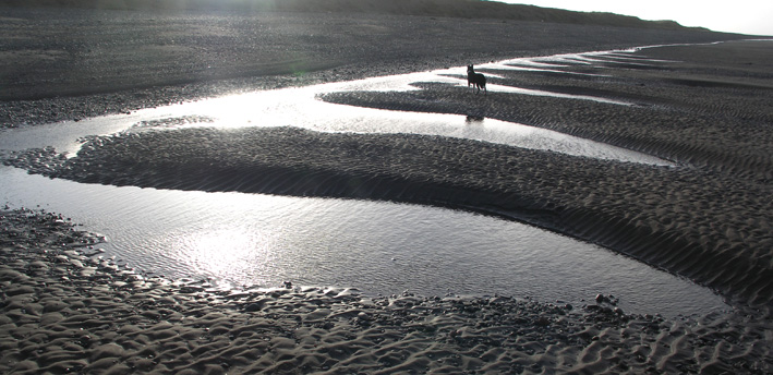 So, since I had requested - weather permitting - a morning excursion to the coast, there I was on the beach, the timing perfect with sun and an outgoing tide, good company and an enthusiastic dog. But the evidence for violence was also apparent. The weather system and the deluge that had devastated Cockermouth and other valley towns had also hit the coast, where, even under normal circumstances, the tides and currents are immense. My companion, a regular observer of this landscape, described how the rows of rotted wooden fish trap posts that we could see running out across the sand flats had barely been visible before. Huge volumes of sand scoured away and flushed violently up the coast. This process was evident from the dramatic series of large sand waves visible high on the beach, just below the eroding dunes (photos below, dog for scale), their shoreward boundary dramatically linear and all suggestive of high velocity water movement.