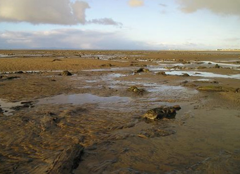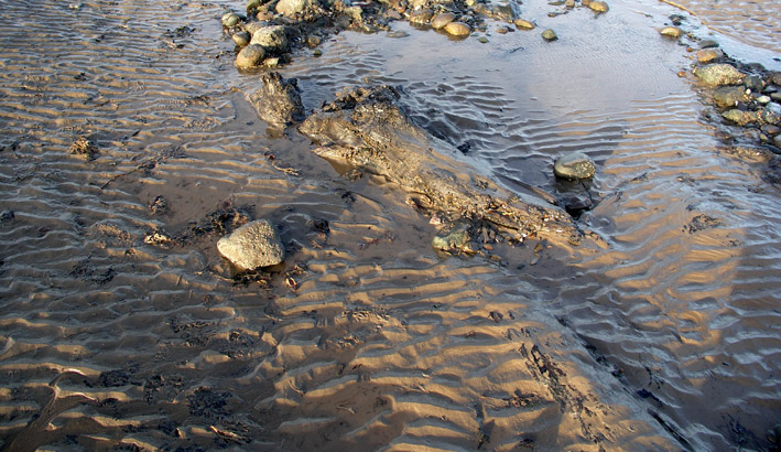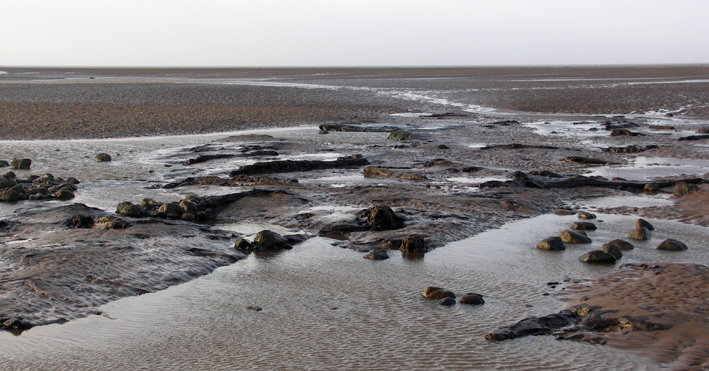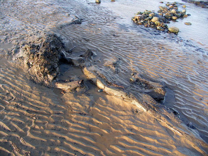 Leave your car at Beckfoot in the carpark amongst the dunes and walk down the track to the new wooden walkway onto the beach: stand there, on the pebbles, looking across the waters of the Firth towards the granite bulk of Criffel. If you are lucky, you may see low dark ‘cliffs’ on the shore, about 100 metres along your Criffel sight-line – a half-metre high, the patches of black are like shadows on the sharp edges of channels in the sand. Now walk down towards them, and the shadows resolve themselves into banks of peat. Poke them with your toe and feel how dense and sodden they are, smoothed by the friction of waves and sand. Walk on them and feel their sponginess. And gradually you’ll become aware that the dark organic mass is not only peat, but contains a horizontal tree-trunk, or even a stump that radiates roots. Wander around and you will find trunks and branches, single and entangled, embedded in the peat and sand; and erect stumps, 20-30 cms high, their tops flattened as though cut by a chainsaw. The wood is still fibrous, soft and dark; you can crumble it and tease it apart, as though it were any rotting log in a woodland. But the difference is that this woodland thrived about 8000 years ago.