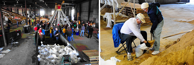 Last Sunday was World Water Day, highlighting the global issues associated with this precious resource. But one of those issues is, as with all natural resources, its distribution, and for the residents of the Red River Valley it’s a case of definitely too much of a good thing, battling as they are against rising flood waters. As I write this, predictions are varying, but the river, along the border between North Dakota and Minnesota and northward to Winnipeg (it’s sometimes referred to as the Red River of the North to distinguish it from the Texan one), is likely to crest up to 20 feet above flood level over the next few days. The residents of Fargo need to fill two million sandbags. It is, so to speak, all hands to the pump, with volunteers coming from all sections of the community - people who have delinquent fines or outstanding arrest warrants have been given a chance to get them withdrawn if they sign up for sandbag duty. Three “spider machines,” shown in the photo at left, above, have been set up to fill sandbags at a rate of 5,000 each every hour, but much of the effort still relies on traditional methods (photo right, above).