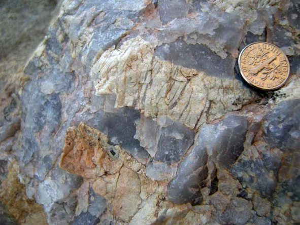 The reason the Spruce Pine calls itself the Mineral City is that in the surrounding hills is a treasure trove of precious and highly valuable industrial minerals - including some of the purest quartz in the world. These minerals, exploited since long before the ancestors of today’s residents arrived, are contained in igneous rocks, solidified from molten material deep below the earth’s surface; but these are special, rocks that are made up of unusually large and unusually pure, crystals - rocks called pegmatites. Below is a photograph of one of these (thanks to Callan at NOVA Geoblog), with large feldspar crystals embedded in quartz. It was long thought that these unusually obese crystals formed because the cooling rate of the molten rock was extremely slow, but this apparently logical model has been replaced by recent research that suggests that the cooling rate was unusually rapid, faster than the rate of crystallisation could keep up with.