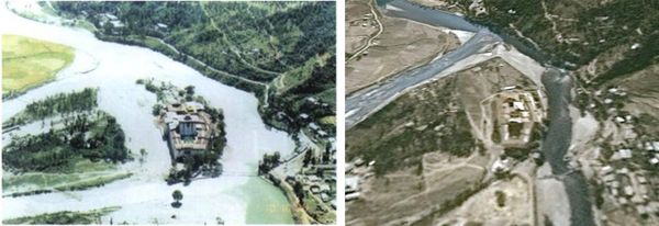 At Punakha, the typical average river flow is perhaps a couple of hundred cubic meters – around a thousand bath tubs – per second. In October 2004, the peak river flow measured downstream from Punakha, and more than a hundred kilometres from the lake, was 2500 cubic meters per second. And this is what Punakha looked like (with a normal view for comparison):