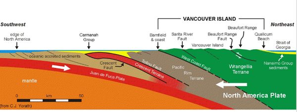 The story of Wrangellia, recounted by this sand, was but an early episode in an ongoing series of events in which successive wandering foreign tectonic chunks accreted themselves to Western Canada – the Pacific Rim Terrane, the Crescent Terrane. And, as this cross-section shows, it’s still going on today. Out in the ocean, far to the west of Vancouver Island, lies the true edge of North America, sediments and oceanic material scraped off the top of the subducting Juan de Fuca Plate, in the fullness of time to make their contribution to the territorial expansion of Vancouver Island.