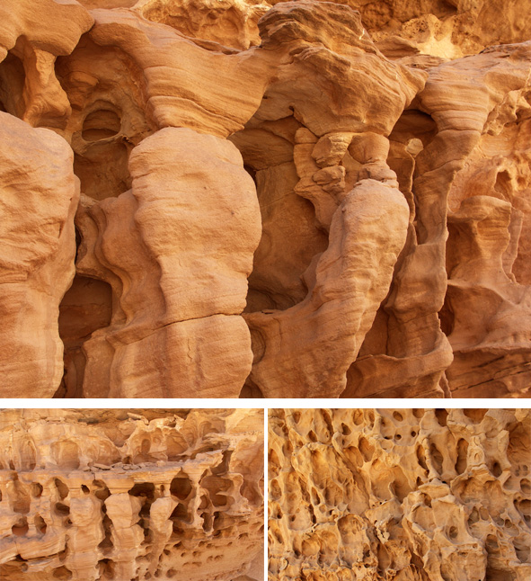 To be quite honest, I’m not sure exactly how that tafonization takes place - but (as shown by the mushrooms), sandblasting only operates up to a couple of meters or so above the ground and these examples were higher than that, so the dominant process, I suspect, is water. Another key question is age - were these actually formed when the Sahara was wetter than today??? Wonderful mysteries!