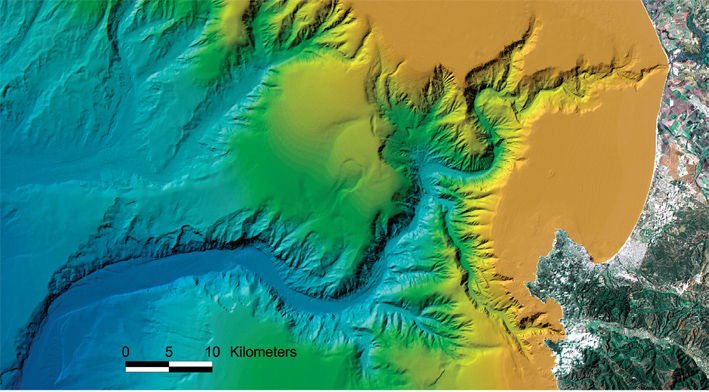 There are two basic questions that have formed the basis for extensive studies over recent years: what are the workings of the canyon today and what is its history and origin? The first question is, in many ways, easier to answer than the second, but I must point out that sand (of course) tells us tales that allow us to address both. Submarine canyons behave in many ways just like their surficial, subaerial relatives: the geometries of tributaries and channels are similar, and at any one point in the canyon system at any given time, erosion, sediment transport and deposition may be occurring, serving to create an ever-evolving complex. As sediments are flushed out of the lower reaches of a canyon, the transport velocity drops and therefore so must the sediment - on land, the canyon may end in in a lake and a large delta will form; in the submarine realm, a canyon will end on the wide expanses of the relatively flat sea floor and, shaped very much like deltas, submarine fans will be deposited. It is the history and interactions of successive flushes of sediment and deposition of fans that provides us with part of the story of a canyon’s history. For the Monterey Canyon, there are two distinct groups of fan deposits, the older group further out than the younger one. The older sediments seem to have started accumulating perhaps as long as 20 million years ago, fed by a system of canyons, not just the ancestor of today’s Monterey Canyon. But we must remember what a tectonically turbulent setting this is, caught between the San Andreas and parallel fault zones offshore - a lot has changed in 20 million years, including moving a long distance northwestward. The younger stack of fan sediments originated within the last million years and continues its activity today; those million years include dynamic changes to the tectonic architecture and topography of this part of California, and the huge fluctuations in sea level during the the Ice Ages - no wonder it’s a complex system.
