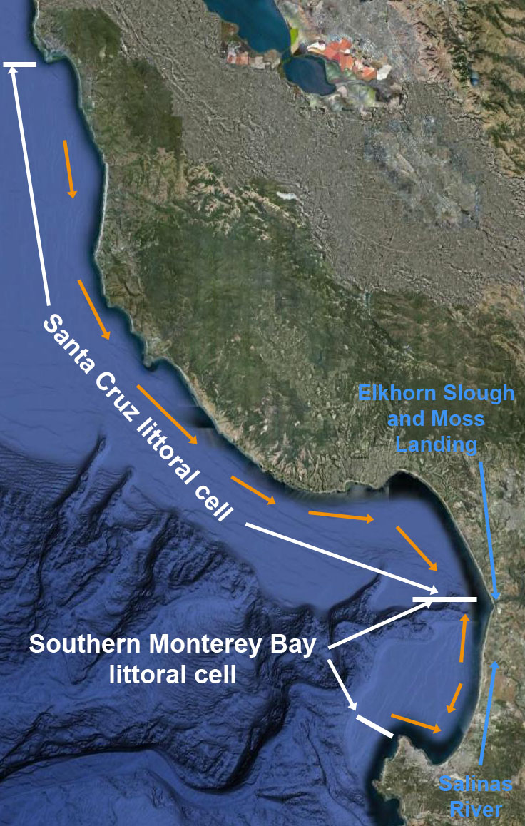 The Monterey Canyon forms, understandably, the boundary between the Santa Cruz and the Southern Monterey Bay littoral cells - it’s the “sink” that permanently sucks sand out of both(for more on littoral cells, see “Beach Nourishment and Sediment Budgets”). General littoral drift, the direction sand transport along the shore, is shown with the orange arrows. For the Santa Cruz cell, sand is transported generally down the coast, all the way from Half Moon Bay (west of the El Corte de Madera Creek tafoni of another earlier post), only to pour over the sides of the canyon and be swept out to sea. South of the canyon, transport along the shore is more complex - in part as a result of the canyon’s topography influencing waves and currents. Three “sub-cells” have been identified, with different senses of sediment transport, influenced too by the Salina River. Interestingly, before 1910, the Salinas flowed northward, parallel to the shoreline, and emptied into Elkhorn Slough, but it then broke through the dunes separating it from the ocean to flow essentially along its current route, where we keep it firmly in place. But the shape and size of the sand accumulation of its mouth suggest that this may have been its preferred long-term itinerary during the ice ages.