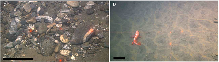 Ongoing processes in the canyon have been studied in many different ways: ROV’s (remotely operated vehicles, miniature submarines laden with instruments) roam its topography, seismic profiles enable us to peer through the layers of sediment and reveal the complexity of the fan systems in cross-section, cores of the sediments are taken, and instruments measuring currents and other data are moored (often temporarily) along its length. ROV images are useful for hunting down equipment that has been swept away, but primarily reveal extraordinary details of events in the canyon. Below, from the paper Trail of Sand in Upper Monterey Canyon (see the references at the end) are images of cobbles flushed down the canyon (their rock types easily correlated with the onshore geology) and sand ripples on the floor of the canyon (the black bars are 10 centimeter scales).
