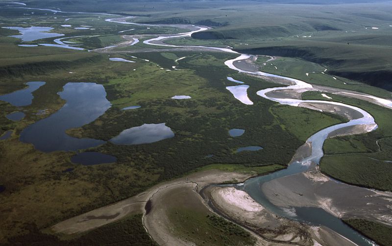Even without erosion or tectonic disruption, nature’s dislike of continuity means that a particular layer will change laterally as we follow it along. To illustrate this, imagine that you, suitably equipped, take a stroll across the Alaskan river valley shown below, taking note of the sediments beneath your feet. In doing so, you will encounter the sands, gravels, and muds of river terrace deposits, old flood deposits, sand bars, active river channels, old, abandoned, river channels and point bars, lakes, vegetated soils, and, as you finally clamber up the side of the valley, much older rocks of the hills into which the river is carving its way.