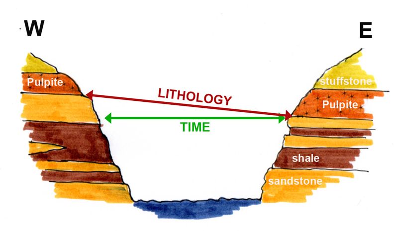 Correlations made on the basis of lithostratigraphy and chronostratigraphy are invariably different. Below, I’ve sketched a cartoon of the two sides of a valley. In this case, we’ve got lucky. High up in the pile is a strange rock that happens to contain newspaper fragments - it’s called, lithologically, pulpite (I am, of course, making this up). Lithostratigraphy leads us to correlate the base of this distinctive layer from one side of the valley to the other. But, on examining the newspaper fragments, we find that, on the eastern side they come from 1954, and on the western side, 1963 - the pulpite is diachronous. The chronostratigraphic correlation, the important one, shows that at the time that the pulpite started being deposited in the east, sandstone, let’s say with all the characteristics of a river point bar, was being deposited further west. We can now begin to put together the picture of the earth’s surface at this location, the paleogeography: a map that shows a pulpite environment of deposition next to a river bank.