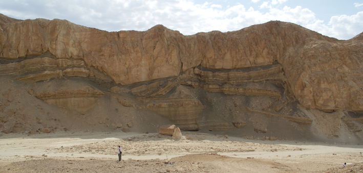 We sometimes talk of rock layers being the ledgers of our planet’s history, and the geologist’s task as being to read those ledgers, to interpret and translate the writing. Stratigraphy, from the Greek for layers and writing, is the branch of geology that attempts to do this job, to set out in three dimensions the sequence of events recorded in different places by piles of rock layers; and really it is the study of four dimensions, since the vertical direction of those layers, assuming they have not been disturbed by the churning of tectonic plates, represents time, successively younger layers piled on older ones. The analogy is often made to a cake - “layer cake stratigraphy” refers to a simple and continuous pile of sedimentary beds; here’s a beach sand, then on top of it a dune sand, and, on top of that the muds and shales deposited in a lagoon. It makes for a nice simple story: sea level dropped, the beach migrated following the receding shoreline, dunes migrated over the old beach and lagoons moved over the old dunes. The sediments in the picture at the head of this post (ignore, for the moment, my reptilian Photoshop frolics) show, from a different environment, layer cake stratigraphy, a nice, simple, pile of sand and mud layers. But the width of this outcrop is only a few meters - try to follow a particular layer for any distance to the left or right and chances are things will change, for nature abhors continuity.