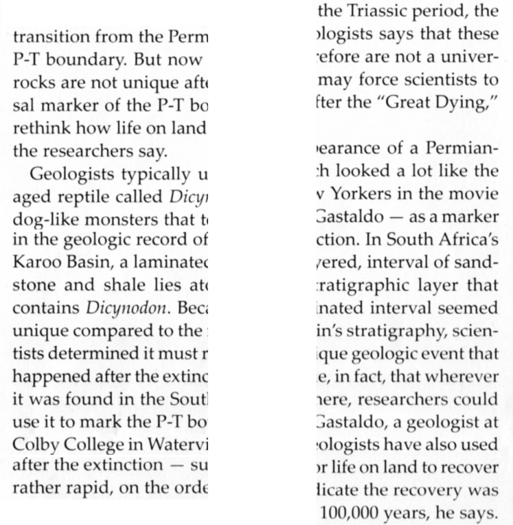 Now, the key to telling the story of a chunk of the earth’s history from outcrops such as this is correlation - taking pieces of the puzzle and putting them together, connecting layers and piles of layers in a way that makes sense, that tells a coherent story (not, for example, one that implies glaciers reaching down onto a tropical beach). Trying to read and correlate the incomplete and discontinuous ledgers is like trying to read an article that has been chopped up. Below is part of one of the articles I shall describe in the next instalment, but I have deleted a narrow column in the middle - the valley - and a couple of lines from the column on the left - sandstone layers that disappear laterally. It’s perfectly possible to correlate across the gap, reconstruct the original, and make suggestions for what the missing words might be - but it’s not simple and the result is open to different interpretations. Nevertheless, the fact remains that it was a coherent article, telling a joined-up, sensible story. It’s worth noting that a single, straightforward, correlation - in this case the paragraph break, is a good place to start, to anchor the puzzle.