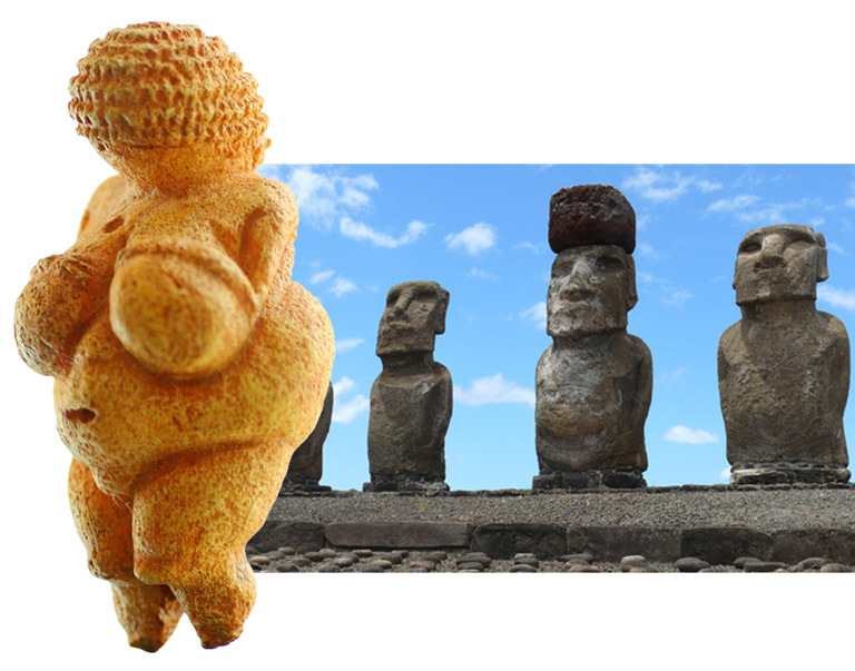 [images of the Venus of Willendorf and the Easter Island Moais reproduced under creative commons license, thanks to Matthias Kabel and Paweł Drozd. Ray Siever’s Sand, published by the Scientific American Library in 1988, is unfortunately no longer in print. Peter Ward and Donald Brownlee’s The Life and Death of Planet Earth is another good read on this entertaining topic.]